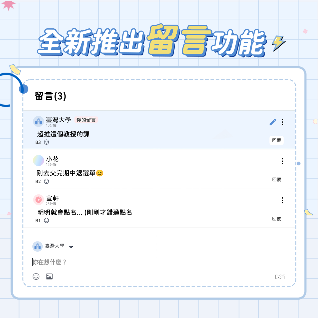 OPT歐趴糖推出全新「留言」功能,在期中水深火熱的你或看到考試成績傻爆眼的你,對這堂課有什麼話都踹共!